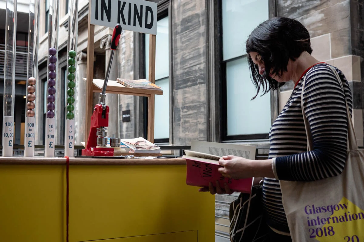The project began in 2018 at Glasgow International festival of Visual Art, interrogating the festival from within, their findings exhibited as part of the festival program. Ailie and Janie invited artists participating in in the festival to log their unpaid labour, exposing the “below the water-line” economy of the arts; charting the unseen and unaccounted for efforts that enable large scale arts festivals to take place. In Kind challenges the apparently successful arts festival model rolled out across major cities, looking at whether this is actually a sustainable model. Since beginning the project in 2018 In Kind events and workshops held at venues across the UK have continued to dig into to the culture of unpaid labour, using their visual arts practice to expose the ways in which such endemic exploitation within the art world exasperates the lack of diversity in the arts, asking who gets to make art and Who Can Afford to Be An Artist?