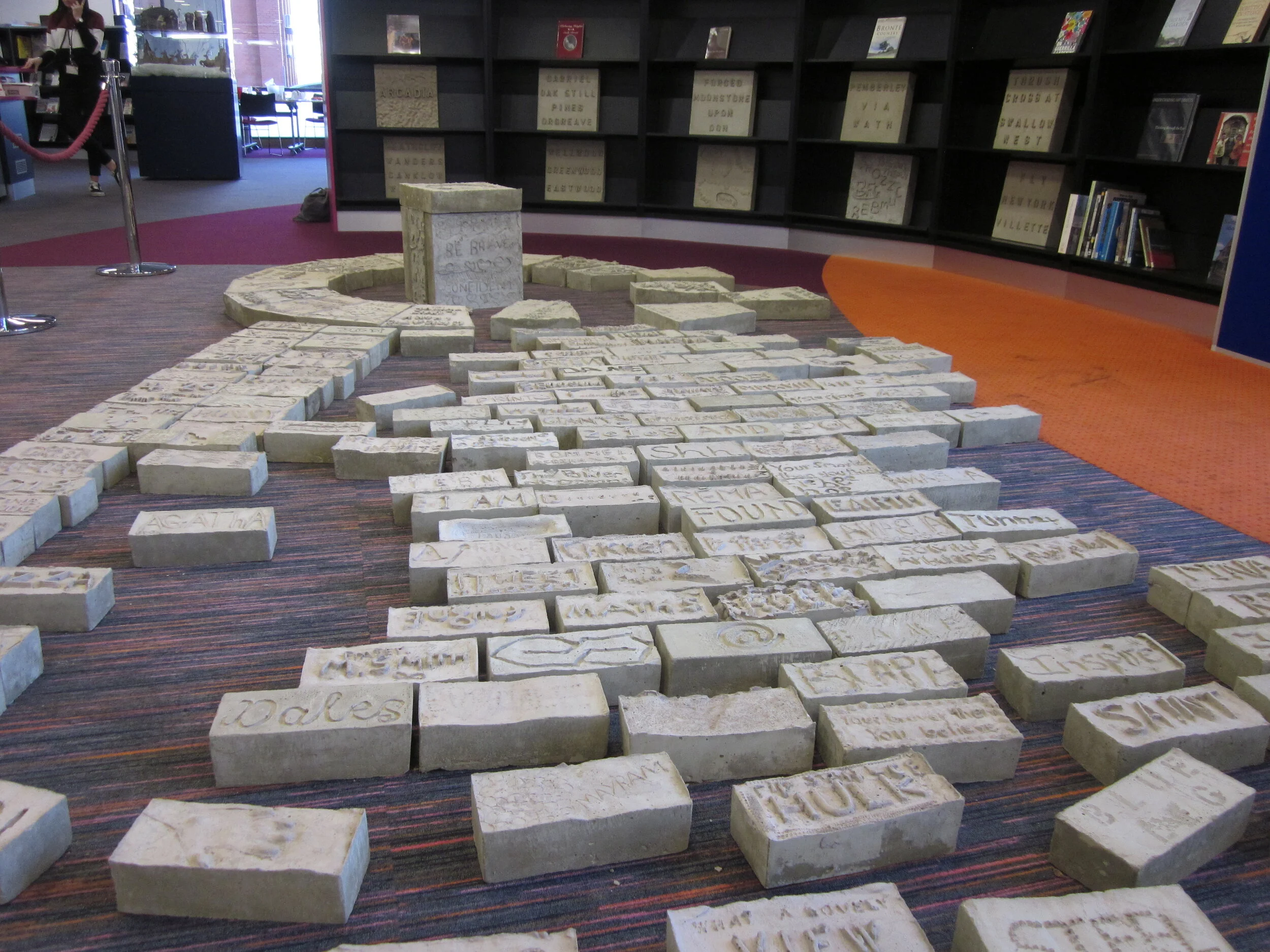 This installation of physical cement poetry has been made by residents of Rotherham who attended workshops run inside the library during the month of October. We supplied the concept, materials, working methods and produced a few of the blocks, our participants created the rest. We hope that our work in Rotherham Riverside Library will continue to inspire similar undertakings by subsequent artists working within libraries. We hope that the ethos embedded in our work and the text blocks themselves, survive.