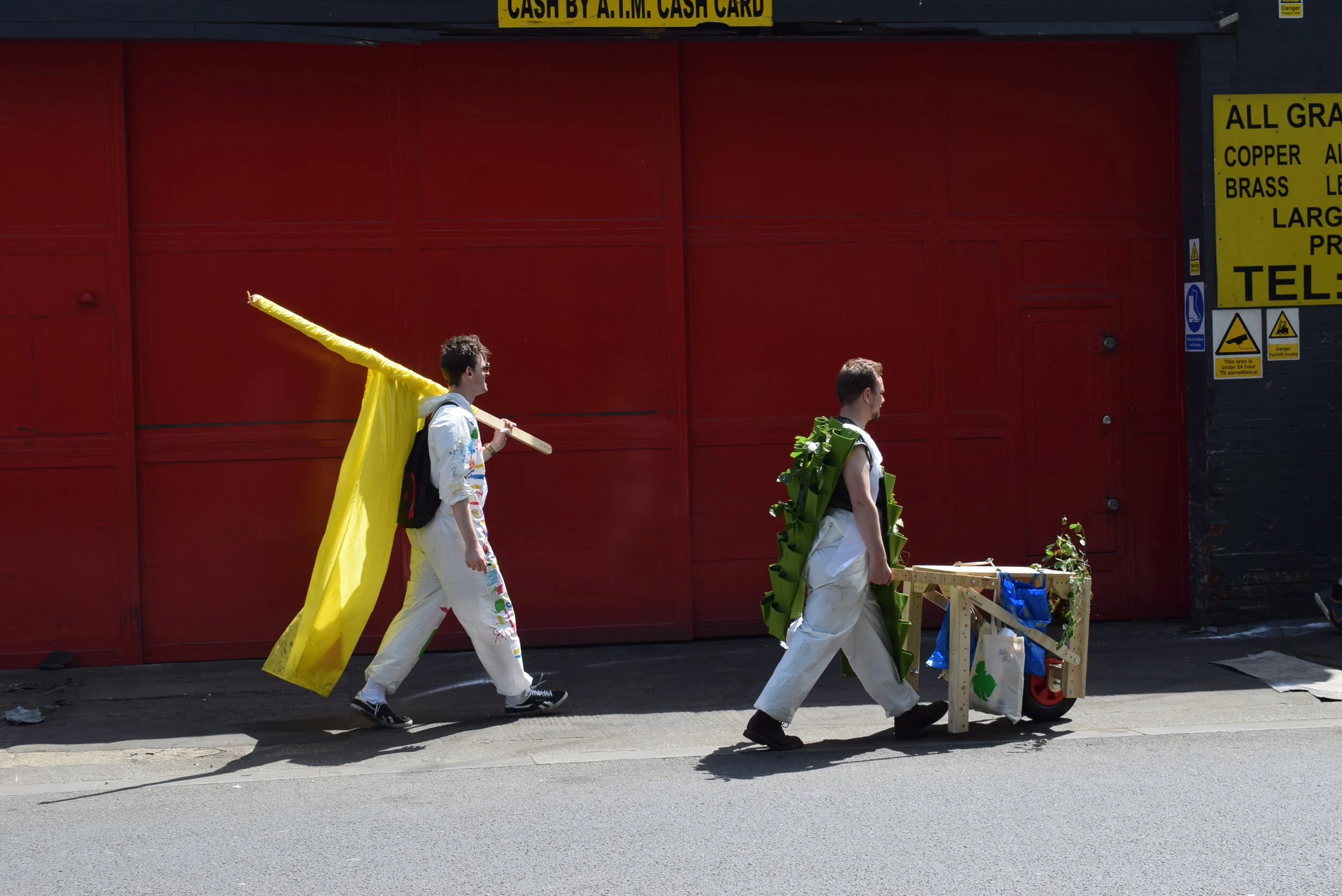 Two performers wearing white overalls walk past a large red garage door. One performer carries a yellow flag, the other wears a green tabard and pushes a wheelbarrow. Photo credit: Studio Polpo.