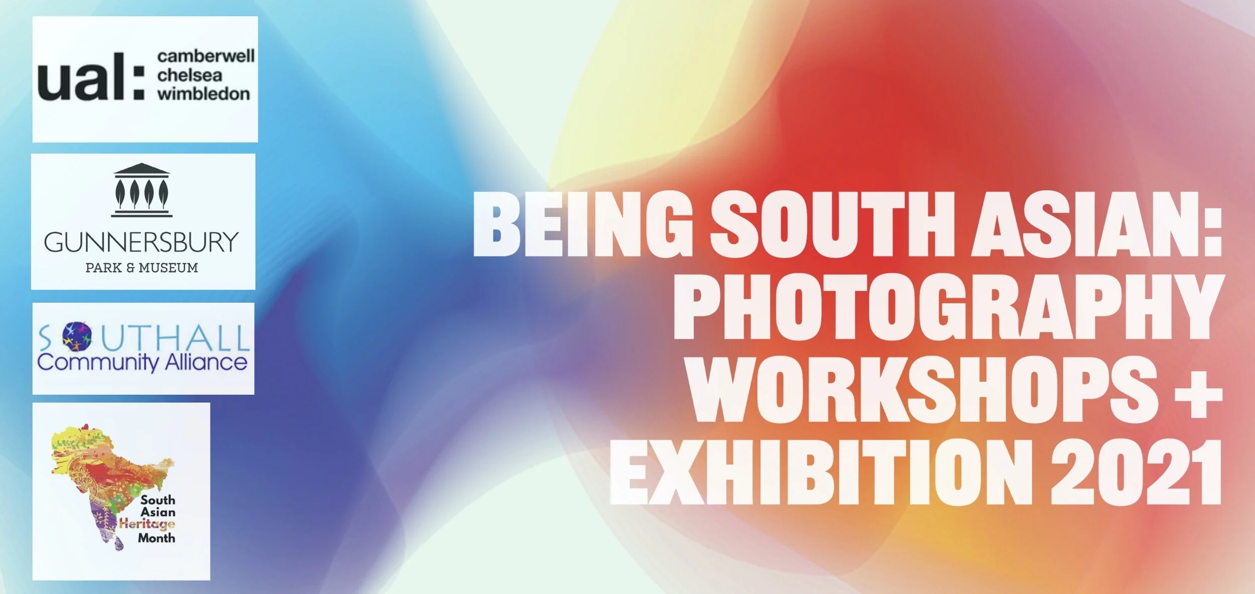 Image description: the top of the Being South Asian flier (white text on a swirling blue, red and yellow background). The text reads ‘Being South Asian: Photography, Workshops + Exhibition 2021’. The flier also displays logos from University of the Arts London, Gunnersbury Park & Museum, Southall Community Alliance, South Asian Heritage Month. Image credit: Mahenderpal Sorya.