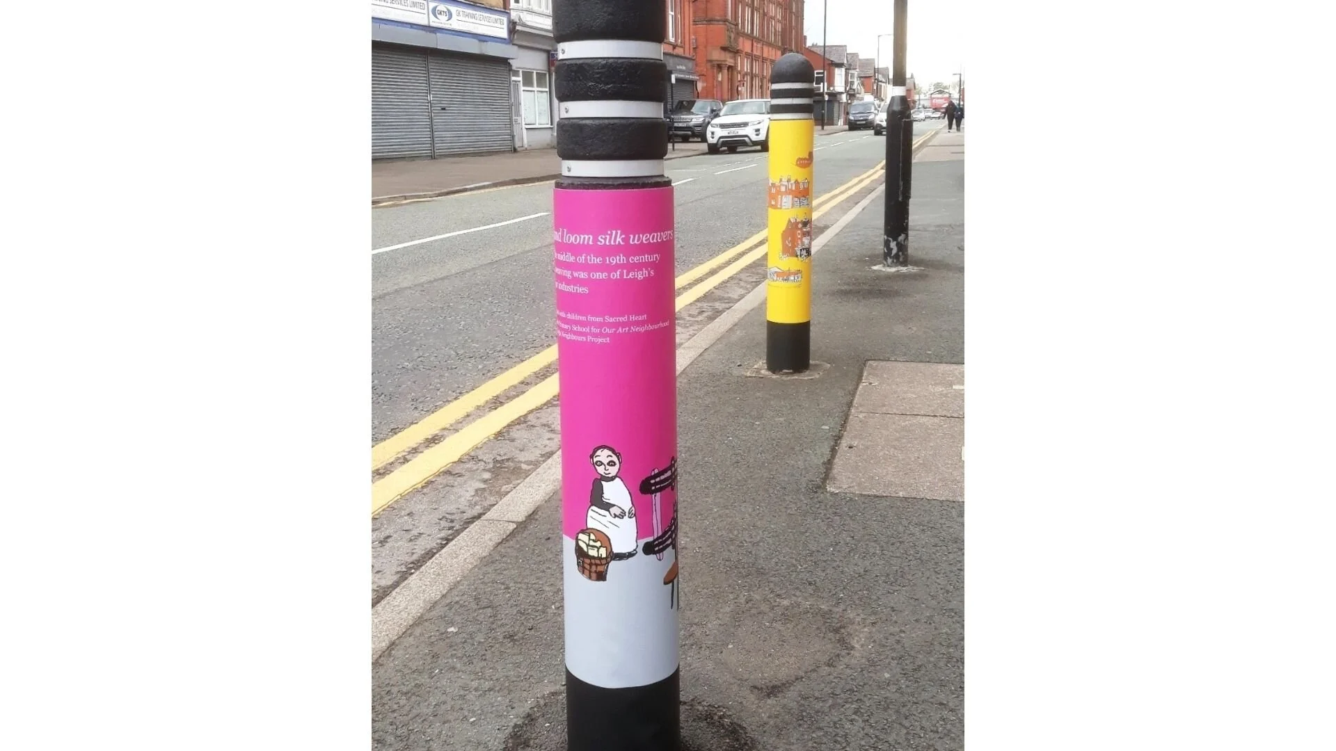 The children’s drawings of industrial heritage, such as Parsonage Colliery and scenes featuring Pit Brow lasses, as well as local buildings and landmarks, provide a colourful and engaging addition to the streets. 14 roadside bollards in the neighbourhood were wrapped in the bespoke artworks and remain as a permanent feature of the street scene. The children investigated some of the history associated with familiar places near the school, such as the Town Hall and the old Grand Theatre (now a pub) and local industry such as coal mining and silk weaving.