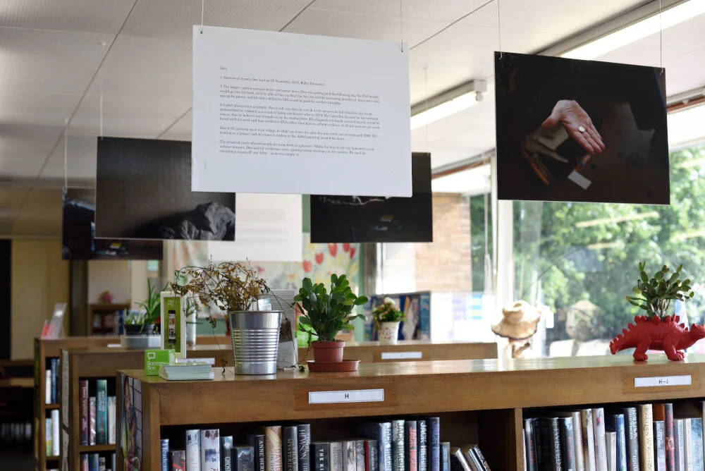 The photographer, Les Monaghan, 'Dave', 'Niamh and 'Aidan', 'Yvette' and 'Levi' and Natasha and Dan and her family. Over six months I worked with these families to produce works that situated government policies within their homes and lives. The results formed an exhibit that toured Doncaster Libraries, and popped up at colleges, community centres, conferences, galleries, other libraries, schools, and other public venues. A pamphlet was produced in time for the 2017 election as well as a legacy website.
